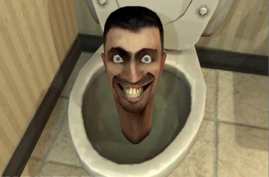 Skibidi Toilet berkarakter wajah manusia seperti hantu yang muncul dari dalam toilet dengan wajah yang lucu dan menakutkan.